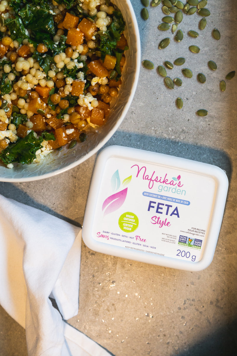 - Pour assembler la salade, disposez le couscous au fond d'un bol de service. Ajouter le chou frisé massé, puis la courge butternut rôtie et les pois chiches. Saupoudrer de graines de citrouille et émietter la feta du Nafsika's Garden sur le dessus. Verser le reste de la vinaigrette sur la salade et mélanger délicatement.